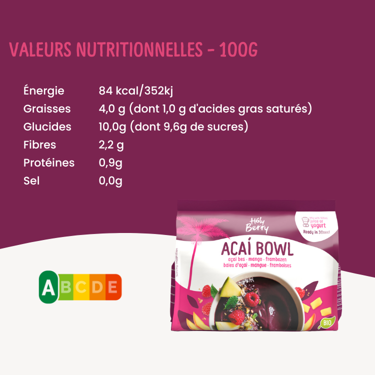 Ceci dans un rapport pour obtenir l’Açai bowl ou smoothie idéal. Sur les 150g, 100g sont de l'Açai, 50g sont d'autres fruits (mangue et framboise ou banane et myrtille).